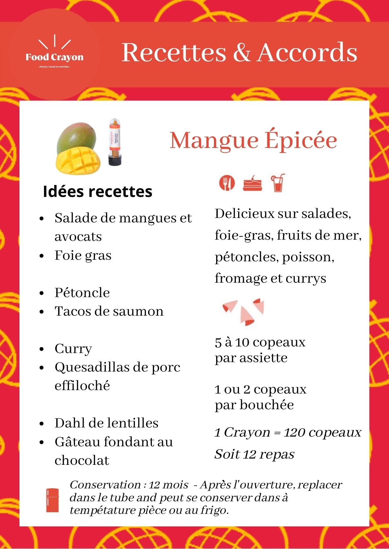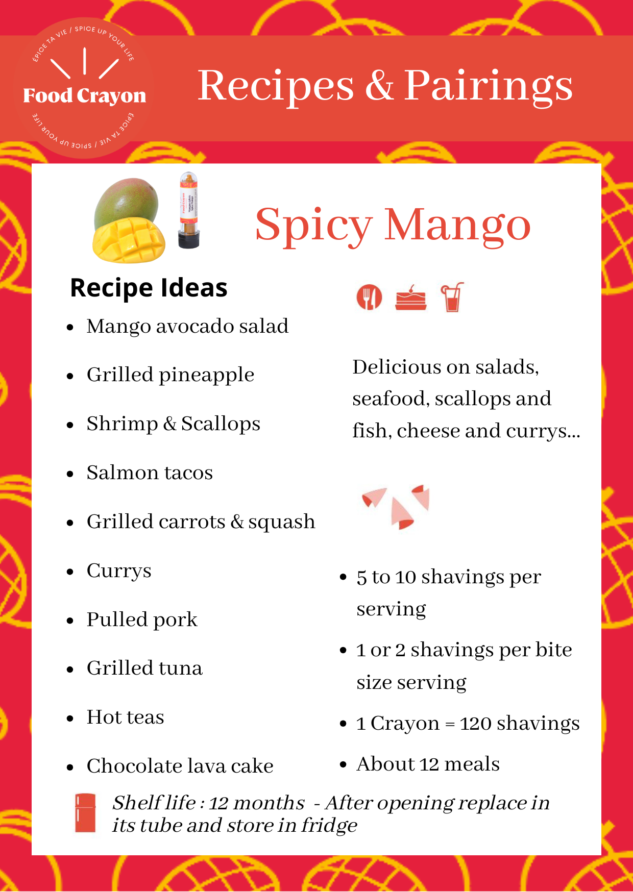 Le Crayon Mangue Épicée est un peu comme un chutney ; sa saveur exotique sucrée-salée s'accorde parfaitement avec vos plats, salades et desserts, à la manière d'une confiture épicée. Excellent sur les fromages, les plats de poisson et les sautés de légumes, il apporte une belle touche aigre-douce.