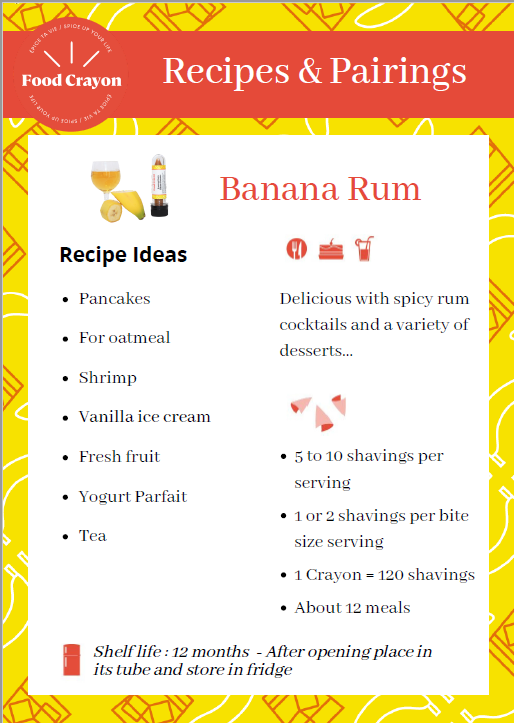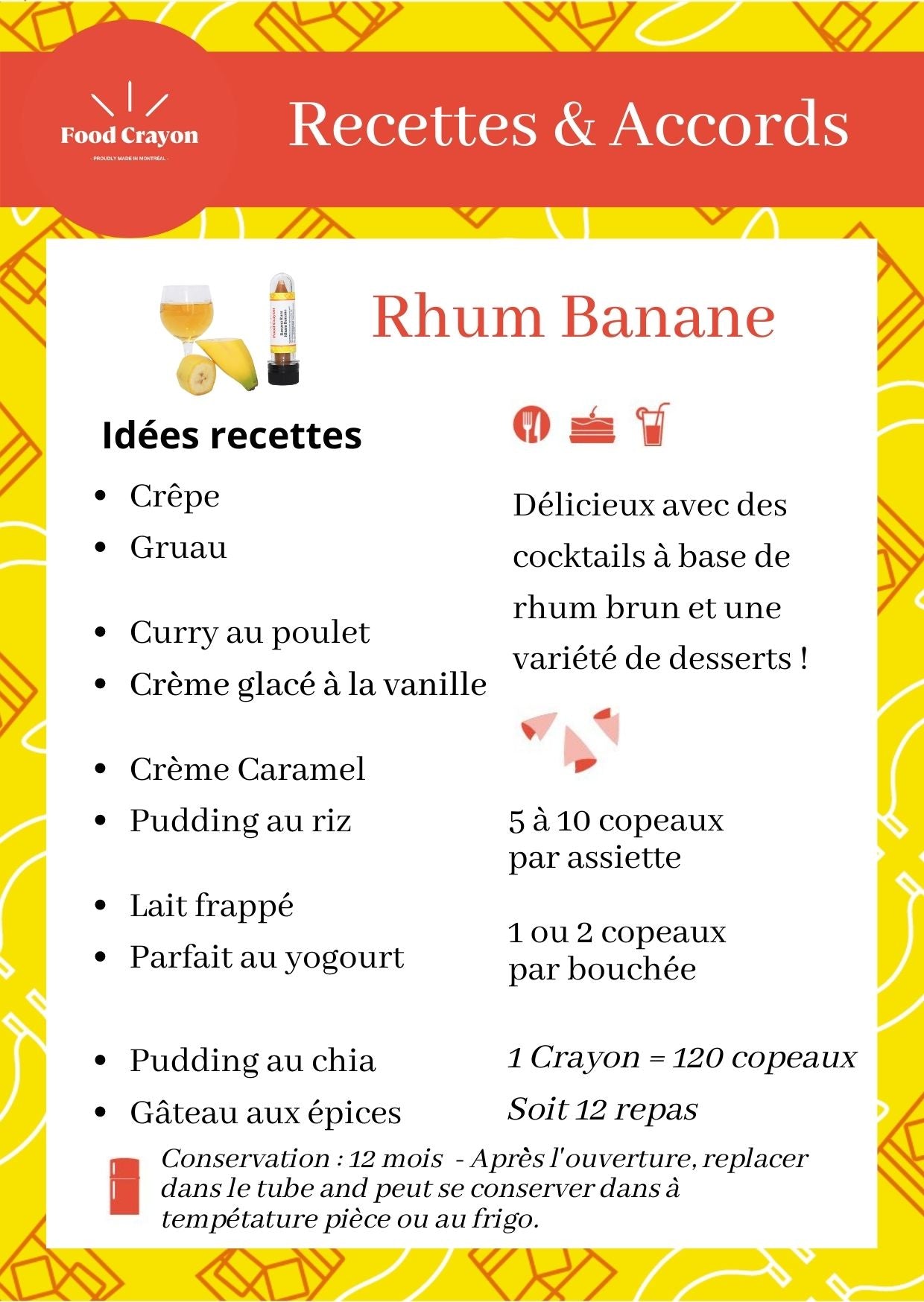 Le Crayon Rhum Banane est idéal en touche finale sur des cocktails à base de rhum. Il est également parfait sur des desserts aux fruits exotiques, des ananas caramélisés, des bananes flambées ou du pain perdu au sirop d'érable. Il apporte une touche exotique à vos desserts qui fait toute la différence.
