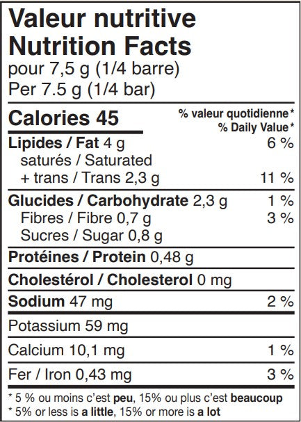 Ingrédients : Beurre de cacao, tomate, curry* (curcuma, coriandre, gingembre, cannelle, fenugrec, oignon, poivre noir, clou de girofle, muscade), oignon*, ail*, cumin*, sel, gingembre*, poivre de Cayenne*, lécithine de soja, coriandre*, curcuma*.
