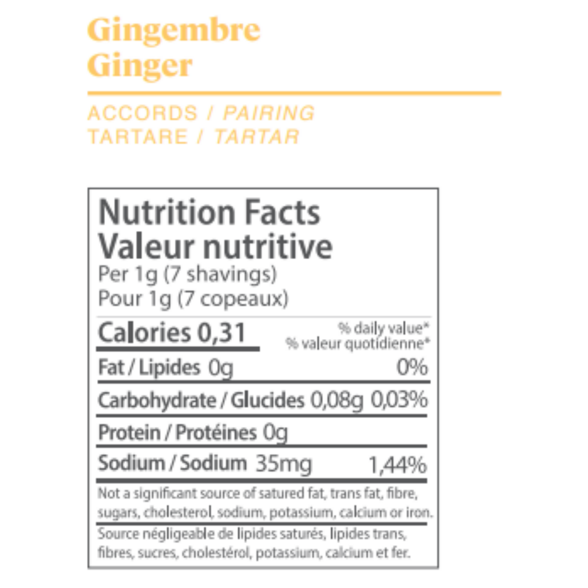 Jus de gingembre, vinaigre de cidre de pomme, eau, sel, agar-agar, tamari sans gluten, gomme de caroube, huile essentielle de gingembre.