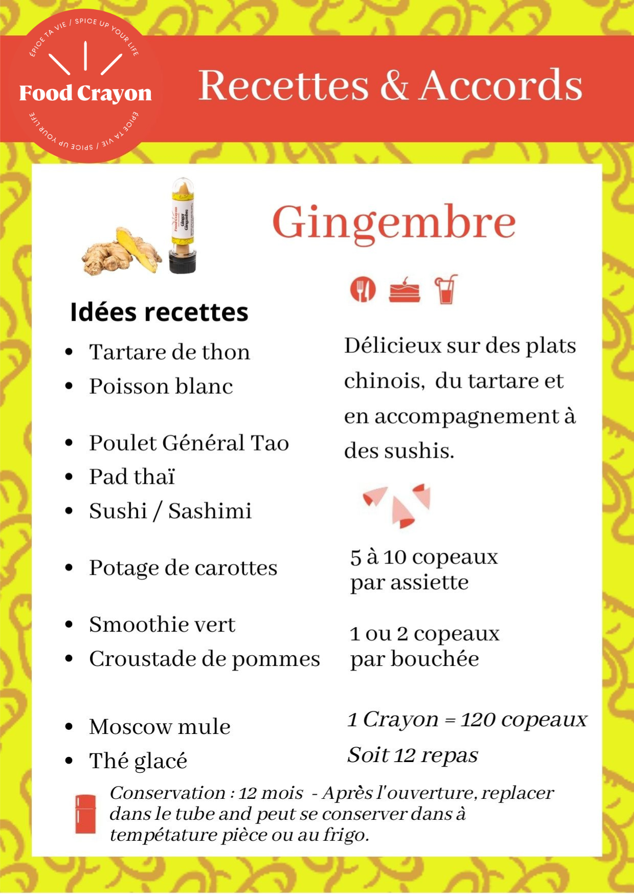 Le gingembre s'associe parfaitement à la cuisine asiatique, aux salades, notamment aux carottes et aux sushis. Notre Food Crayon au gingembre est élaboré à partir de jus de gingembre frais, offrant un parfum épicé et frais.